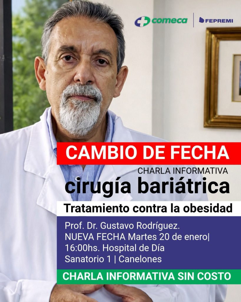 LA ACTIVIDAD SE POSPONE PARA EL MARTES 20 DE ENERO a las 16 hs,te esperamos en sanatorio 1 de COMECA Hospital de Día para una charla sobre cirugía Bariátrica en el tratamiento de la obesidad , brindada por el Prof. Dr.Gustavo Rodríguez. Tendrás la oportunidad de informarte y evacuar todas las dudas . Charla sin costo.